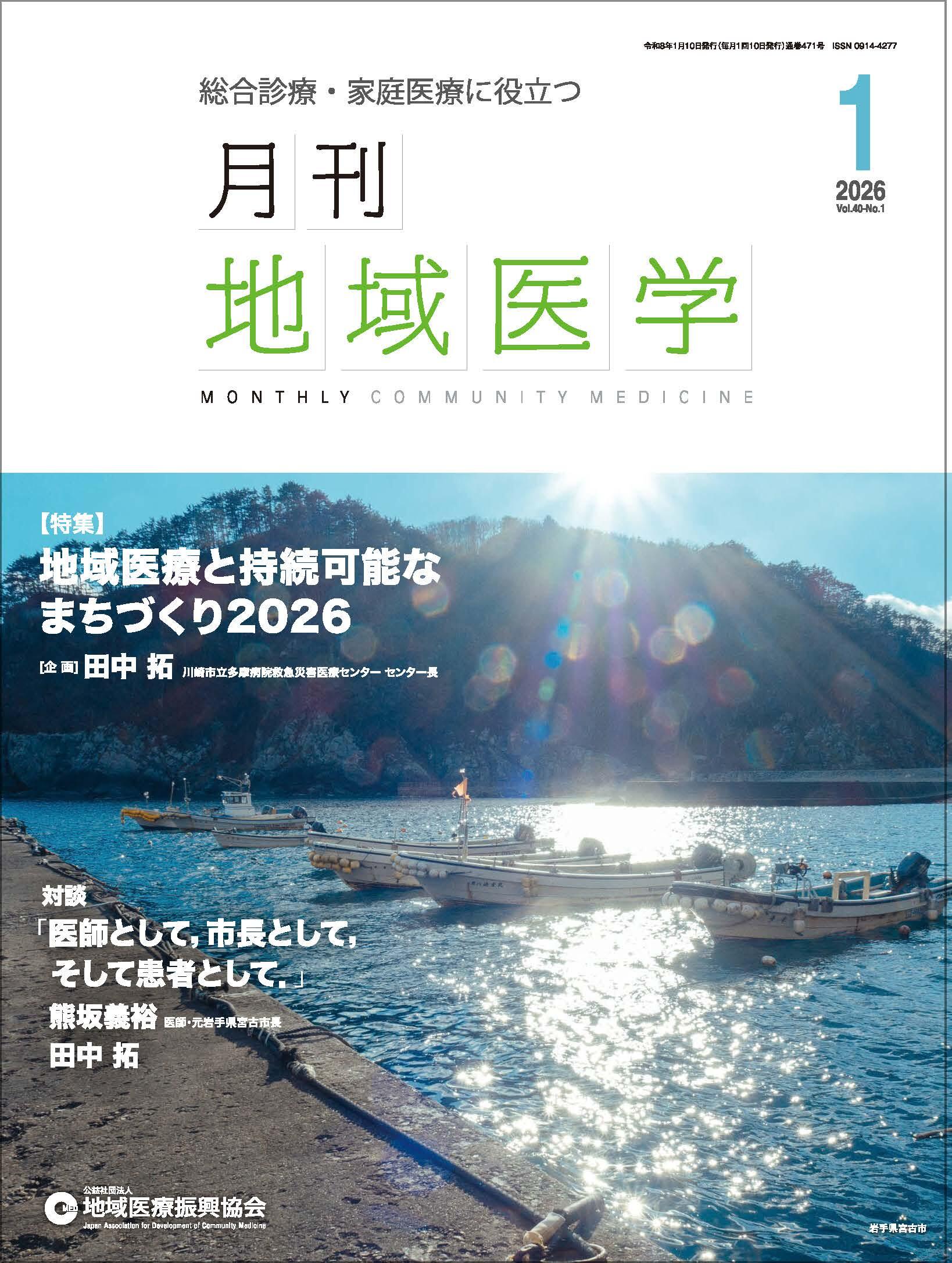 Vol.40/1 2026年1月発行 ●目次 対談 医師として,市長として,そして患者として./熊坂義裕×田中 拓 特集 地域医療と持続可能なまちづくり2026 エディトリアル/田中 拓 総論:持続可能な医療システムづくり・まちづくりと医療者の役割/今中雄一 徳島県上勝町の持続可能なまちづくり/幸田朋也 紀宝町のまちづくり -地域医療が育む,人とコミュニティの物語-/森本真之助 縮充という新しいモノサシ -兵庫県佐用町の挑戦と養父市の社会的処方からの考察-/佐伯亮太 明日香村での15年 今までとこれから/武田以知郎 震災復興とまちづくり,その経過/齋藤 充 地域住民主体の健康づくりと保健師の役割 -まめなかな和良21プランの実践から-/島田紫香 Let’s Try! 医療安全 具体的事例から考える医療安全!“未然防止の取り組み” 第147回 医師の“業務の引継ぎ”に関わる事例発生を未然防止する!-事例の発生要因から考える未然防止対策-/石川雅彦 JADECOM生涯教育 e-Learning紹介 不正論文から学ぶ論文執筆 前編 全国の地域からリレーでつなぐ 私の地域医療 岡山県 診療以外の仕事もある地域医療/河本翔一 岐阜県 地域医療に携わって/清水洋範 JADECOMアカデミー NP・NDC研修センター 特定ケア看護師の挑戦 たくさんの方々に支えられて,日々前進/友井奈月 研修医日記 初めての外病院研修!/阿瀬雅己 自治医大NOW 令和8年度後期研修・短期実習研修の受け入れ/研究生の受け入れ/「第16回自治医科大学顧問指導・学外卒後指導委員合同会議」を開催/「第18回地域医療フォーラム2025」を開催/日本医学教育評価機構(JACME)による医学教育分野別評価(2巡目)認定/第52回 自治医科大学慰霊祭を執行/自治医科大学および附属病院(附属病院・附属さいたま医療センター)への支援のお願い 月刊地域医学 バックナンバー Vol.40/1 2026年1月発行 Vol.39/12 2025年12月発行 Vol.39/11 2025年11月発行 Vol.39/10 2025年10月発行 Vol.39/9 2025年9月発行 Vol.39/8 2025年8月発行 Vol.39/7 2025年7月発行 Vol.39/6 2025年6月発行 Vol.39/5 2025年5月発行 Vol.39/4 2025年4月発行 Vol.39/3 2025年3月発行 Vol.39/2 2025年2月発行 Vol.39/1 2025年1月発行 Vol.38/12 2024年12月発行 Vol.38/11 2024年11月発行 Vol.38/10 2024年10月発行 Vol.38/9 2024年09月発行 Vol.38/8 2024年08月発行 Vol.38/7 2024年07月発行 Vol.38/6 2024年06月発行 Vol.38/5 2024年05月発行 Vol.38/4 2024年04月発行 Vol.38/3 2024年03月発行 Vol.38/2 2024年02月発行 Vol.38/1 2024年01月発行 Vol.37/12 2023年12月発行 Vol.37/11 2023年11月発行 Vol.37/10 2023年10月発行 Vol.37/9 2023年09月発行 Vol.37/8 2023年08月発行 Vol.37/7 2023年07月発行 Vol.37/6 2023年06月発行 Vol.37/5 2023年05月発行 Vol.37/4 2023年04月発行 Vol.37/3 2023年03月発行 Vol.37/2 2023年02月発行 Vol.37/1 2023年01月発行 Vol.36/12 2022年12月発行 Vol.36/11 2022年11月発行 Vol.36/10 2022年10月発行 Vol.36/9 2022年09月発行 Vol.36/8 2022年08月発行 Vol.36/7 2022年07月発行 Vol.36/6 2022年06月発行 Vol.36/5 2022年05月発行 Vol.36/4 2022年04月発行 Vol.36/3 2022年03月発行 Vol.36/2 2022年02月発行 Vol.36/1 2022年01月発行 Vol.35/12 2021年12月発行 Vol.35/11 2021年11月発行 Vol.35/10 2021年10月発行 Vol.35/9 2021年09月発行 Vol.35/8 2021年08月発行 Vol.35/7 2021年07月発行 Vol.35/6 2021年06月発行 Vol.35/5 2021年05月発行 Vol.35/4 2021年04月発行 Vol.35/3 2021年03月発行 Vol.35/2 2021年02月発行 Vol.35/1 2021年01月発行 Vol.34/12 2020年12月発行 Vol.34/11 2020年11月発行 Vol.34/10 2020年10月発行 Vol.34/9 2020年09月発行 Vol.34/8 2020年08月発行 Vol.34/7 2020年07月発行 Vol.34/6 2020年06月発行 Vol.34/5 2020年05月発行 Vol.34/4 2020年04月発行 Vol.34/3 2020年03月発行 Vol.34/2 2020年02月発行 Vol.34/1 2020年01月発行 Vol.33/12 2019年12月発行 Vol.33/11 2019年11月発行 Vol.33/10 2019年10月発行 Vol.33/9 2019年09月発行 Vol.33/8 2019年08月発行 Vol.33/7 2019年07月発行 Vol.33/6 2019年06月発行 Vol.33/5 2019年05月発行 Vol.33/4 2019年04月発行 Vol.33/3 2019年03月発行 Vol.33/2 2019年02月発行 Vol.33/1 2019年01月発行 Vol.32/12 2018年12月発行 Vol.32/11 2018年11月発行 Vol.32/10 2018年10月発行 Vol.32/9 2018年09月発行 Vol.32/8 2018年08月発行 Vol.32/7 2018年07月発行 Vol.32/6 2018年06月発行 Vol.32/5 2018年05月発行 Vol.32/4 2018年04月発行 Vol.32/3 2018年03月発行 Vol.32/2 2018年02月発行 Vol.32/1 2018年01月発行 Vol.31/12 2017年12月発行 Vol.31/11 2017年11月発行 Vol.31/10 2017年10月発行 Vol.31/9 2017年09月発行 Vol.31/8 2017年08月発行 Vol.31/7 2017年07月発行 Vol.31/6 2017年06月発行 Vol.31/5 2017年05月発行 Vol.31/4 2017年04月発行 Vol.31/3 2017年03月発行 Vol.31/2 2017年02月発行 Vol.31/1 2017年01月発行 Vol.30/12 2016年12月発行 Vol.30/11 2016年11月発行 Vol.30/10 2016年10月発行 Vol.30/9 2016年09月発行 Vol.30/8 2016年08月発行 Vol.30/7 2016年07月発行 Vol.30/6 2016年06月発行 Vol.30/5 2016年05月発行 Vol.30/4 2016年04月発行 Vol.30/3 2016年03月発行 Vol.30/2 2016年02月発行 Vol.30/1 2016年01月発行 Vol.29/12 2015年12月発行 Vol.29/11 2015年11月発行 Vol.29/10 2015年10月発行 Vol.29/9 2015年09月発行 Vol.29/8 2015年08月発行 Vol.29/7 2015年07月発行 Vol.29/6 2015年06月発行 Vol.29/5 2015年05月発行 Vol.29/4 2015年04月発行 Vol.29/3 2015年03月発行 Vol.29/2 2015年02月発行 Vol.29/1 2015年01月発行 Vol.28/12 2014年12月発行 Vol.28/11 2014年11月発行 Vol.28/10 2014年10月発行 Vol.28/9 2014年09月発行 Vol.28/8 2014